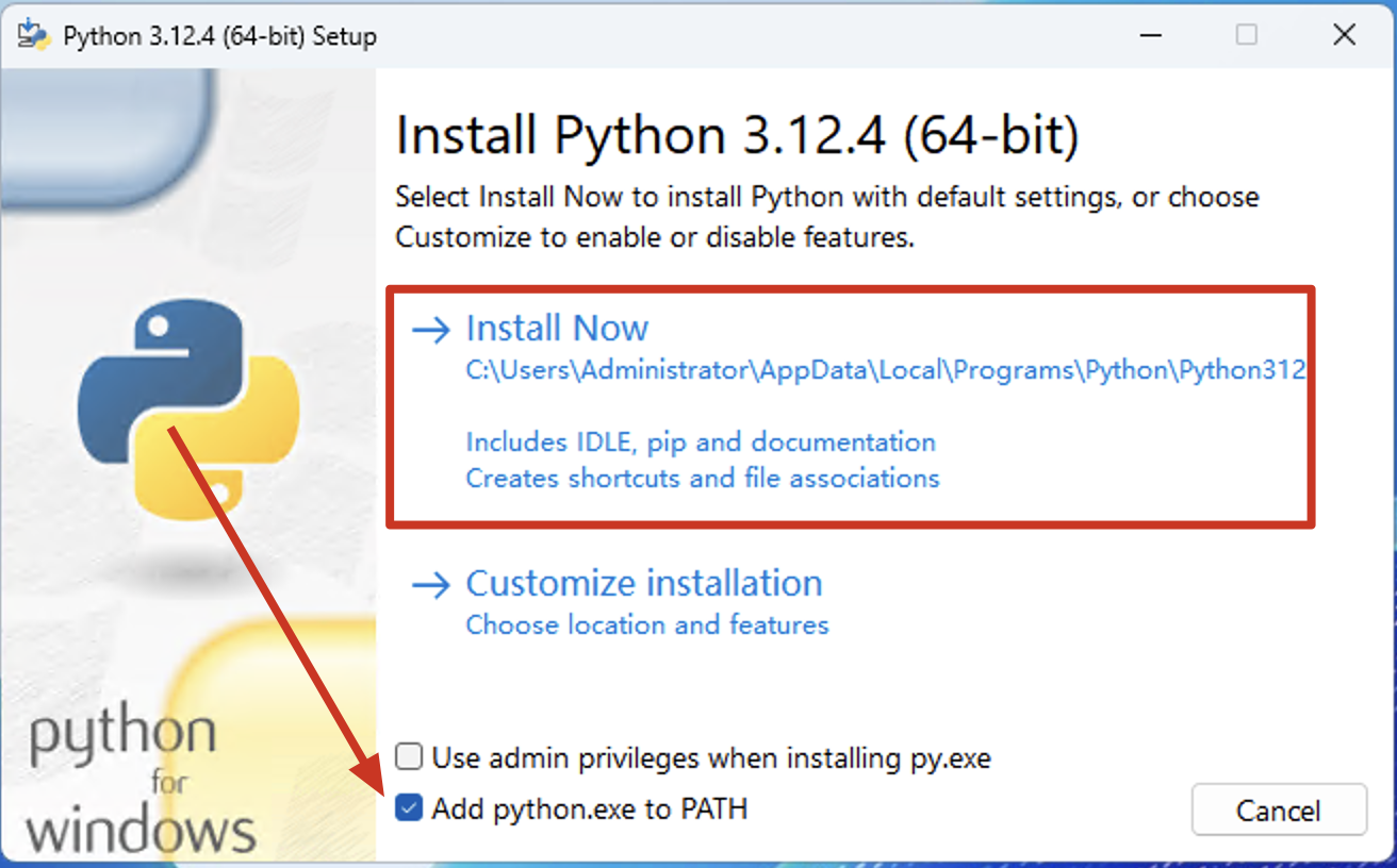 首先点击下面的Add python.exe to PATH打对勾,然后点击Install Now: -